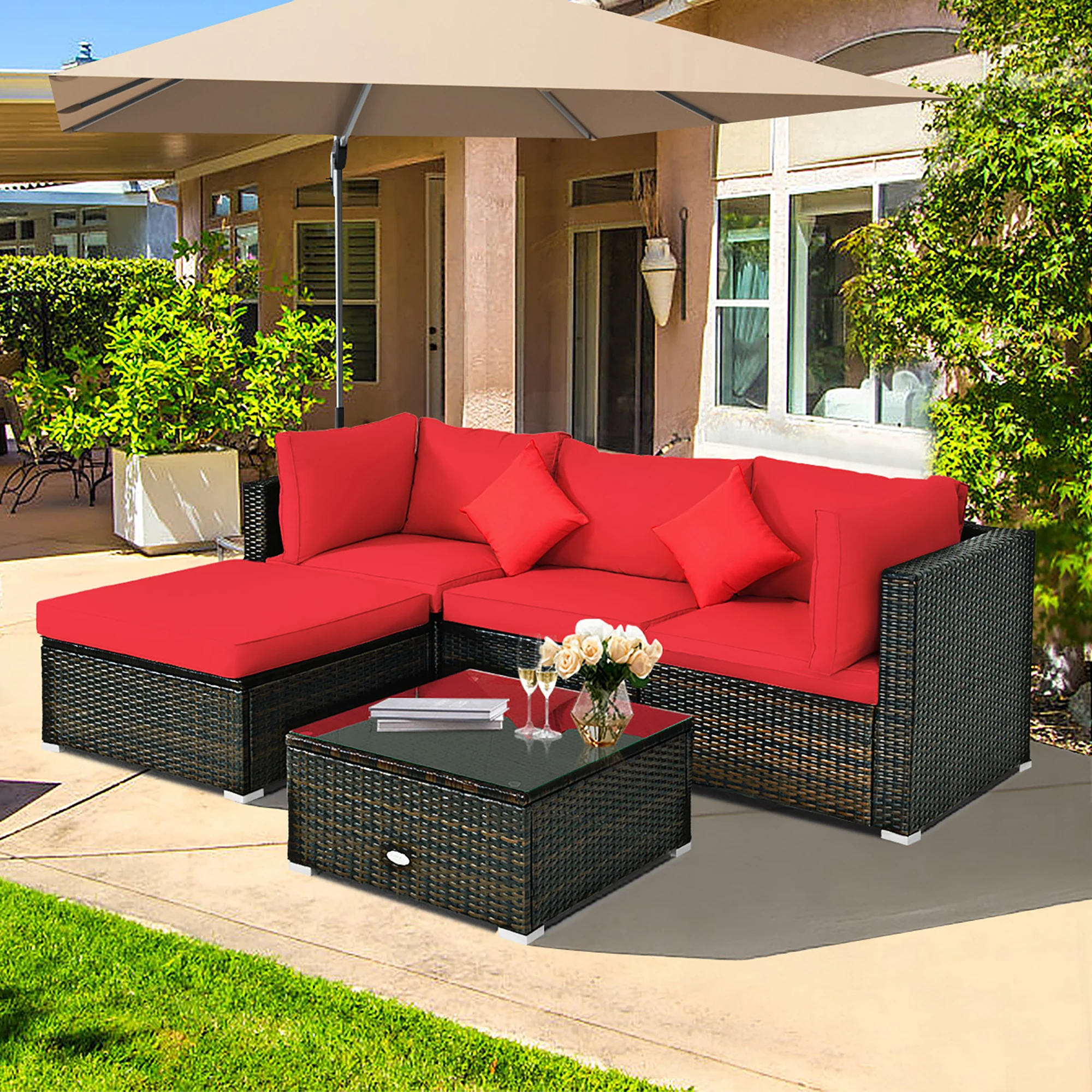 Are you waiting for a proper rattan chair set to spend the leisure time? Sturdy and solid steel frame with all weather PE rattan can keep stability and durability for long time use. Soft cushions will hold you comfortably and the cover of cushion can be removed with smooth zipper. There is enough space to provide enough sitting space for several people. You can also regard the coffee table as an ottoman by removing the tempered glass top for more sitting space. Featuring with 1 armless sofa, 2 corner sofas, 1 ottoman and 1 coffee table, this patio furniture set can be combined in various ways according to your different needs. Just sit on the sofas and enjoy the sunshine in front of the pool or on the patio with your loved ones.