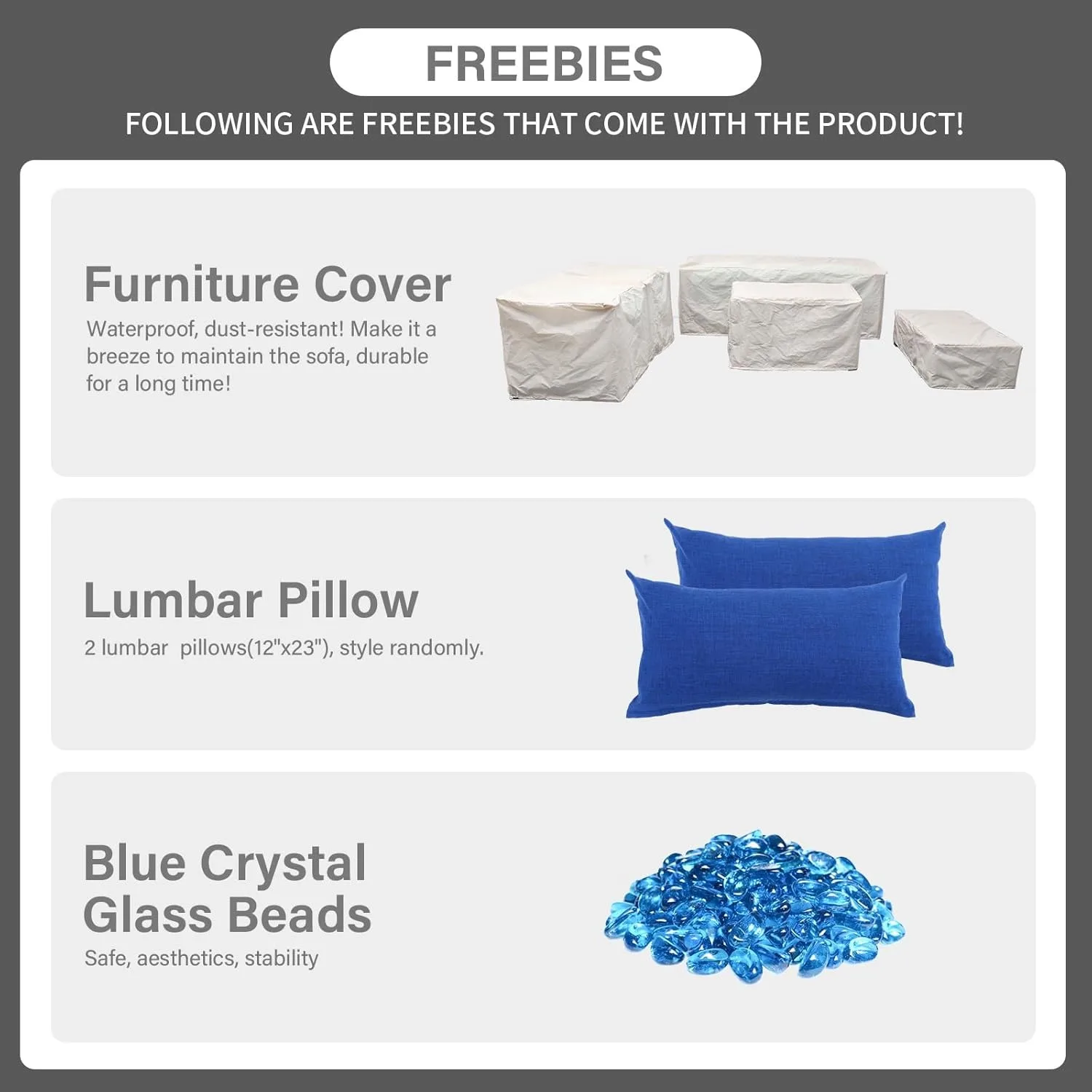 Propane Fire Pit: 60000 BTU outdoor gas fire pit equipped with 20 lbs propane tank(need purchased separately), a patio table after closing the fire lid and surrounding the woodgrain marble tile tabletop, extend the use scenario and enjoy the great outdoors; steel embossed rattan look, fire pit wind guard, stainless steel burners, and blue crystal beads in which flame dances all of them ooze a cozy and intoxicated feel, creating a wild-joy resort on the outdoor sectional furniture ensemble